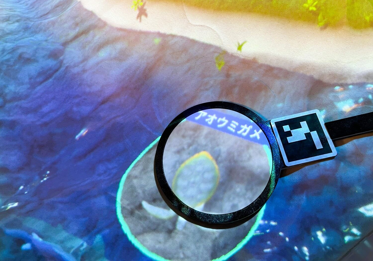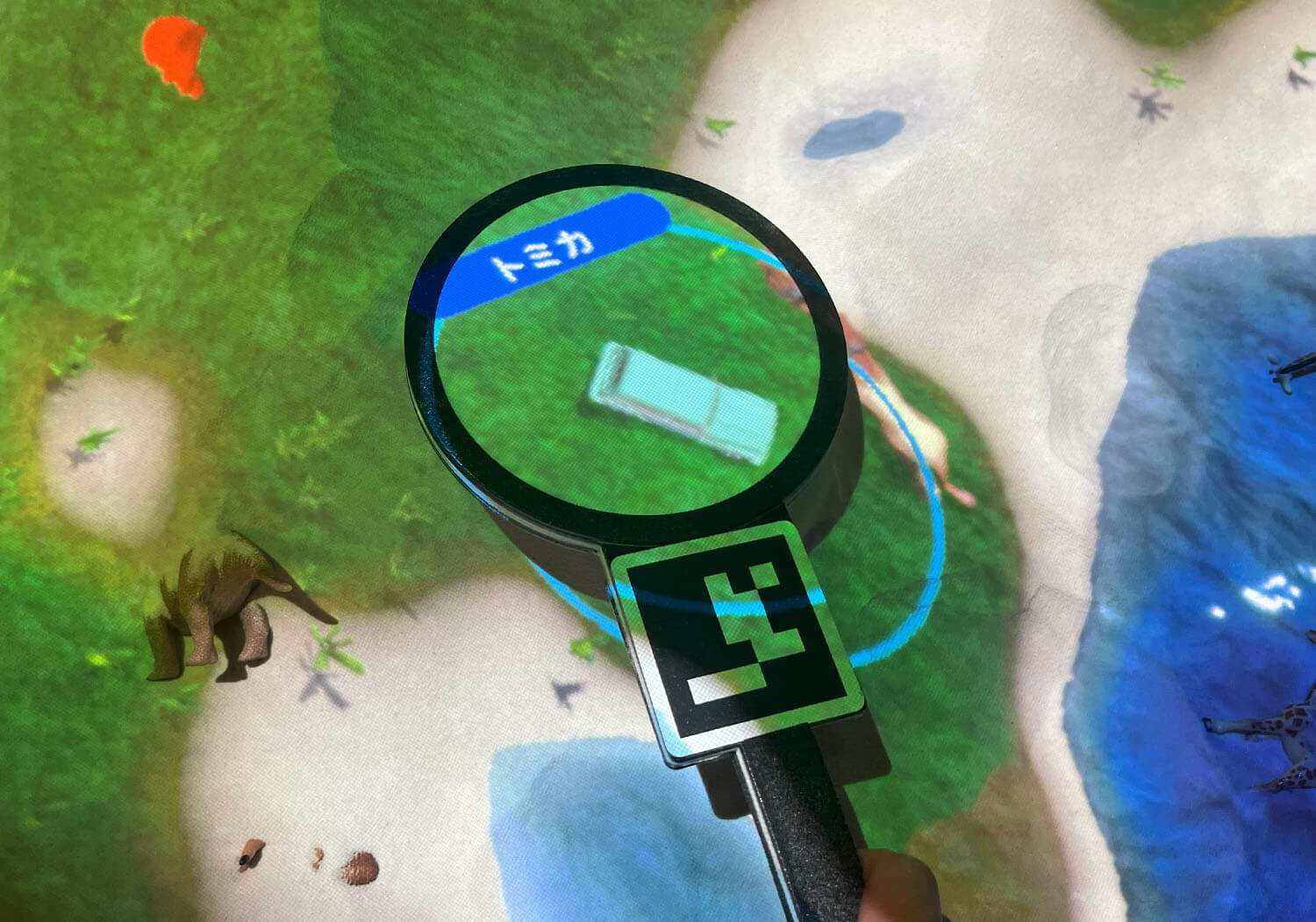 地形に合わせて砂の上にアニアの動物たちが登場するよ。虫めがねをかざして名前を調べてみよう。時にはトミカが出現することも?